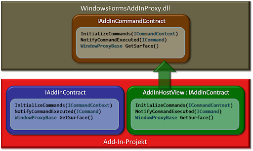 Diese definiert ebenfalls die GetSurface()-Methode, gibt jedoch eine WindowProxyBase-Instanz zurück. Auf Host-Seite wird die Methode durch die AddInHostView-Klasse bereit gestellt.