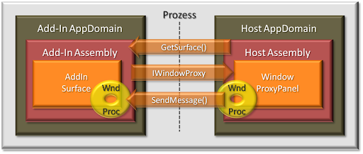Die eigentliche Kommunikation findet jedoch über die Klassen AddInSurface (Add-In-Seite) und WindowProxyPanel (Host-Seite) statt. Letztere bekommt über die SetWindow()-Methode eine WindowProxyBase-Instanz übergeben und „kapert“ daraufhin das zugehörige Fenster.