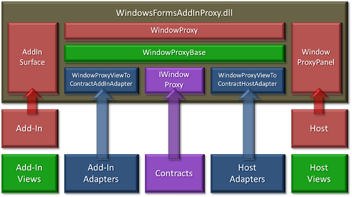 Nachdem ich im ersten Teil den grundlegenden Aufbau der WindowsFormsAddInProxy.dll beschrieben habe, soll es nun um die Details der Implementierung gehen. Zum besseren Verständnis der beteiligten Komponenten, hier zunächst einmal der Aufbau der Assembly: